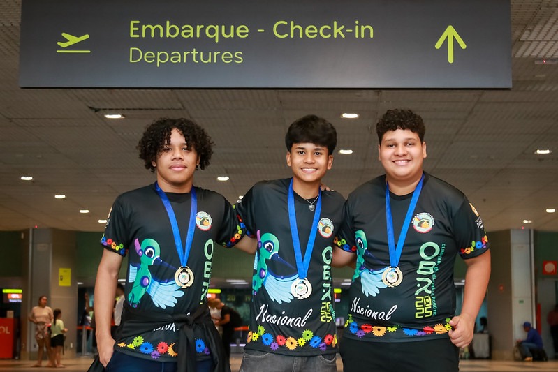 Os alunos Andrew Martins, de 15 anos, Isaac Silva, de 16 anos, e Lucas Oliveira, 13 anos, junto com o professor de ciências e robótica Hermann Oliveira, embarcaram nesta segunda-feira, 13/10, rumo ao Espírito Santo, onde vão competir com estudantes de todo o Brasil.