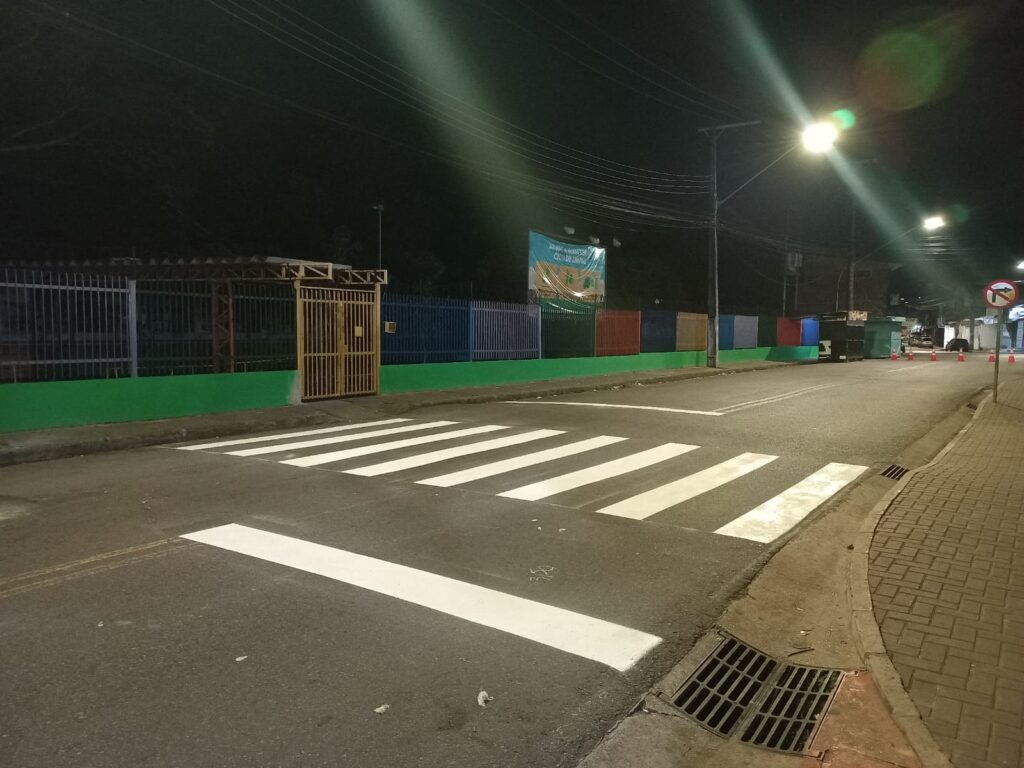 Outro ponto atendido foi a avenida Cosme Ferreira, no cruzamento com a rua Antônio Matias, em frente ao colégio adventista Paul Bernard até a rua Miguel Faraday, no bairro São José 1, onde foi aplicada linha amarela contínua indicando proibição de estacionamento.